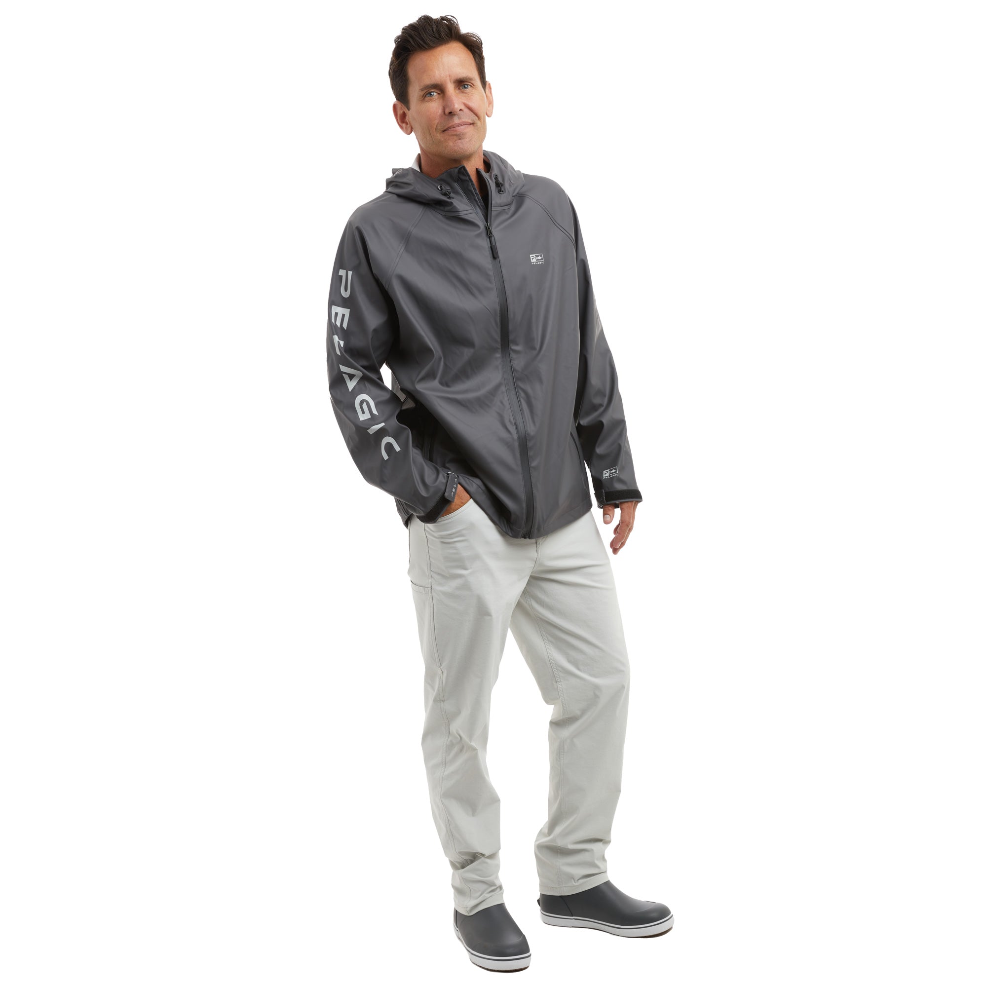 The Chubasco 2 layer PU shell jacket will keep you dry in any condition, ideal for warm weather squalls or layering in cool temperatures. Featuring welded seams, 4-way stretch recycled fabric, zippered hand pockets, adjustable cinch hood, and velcro cuffs.
