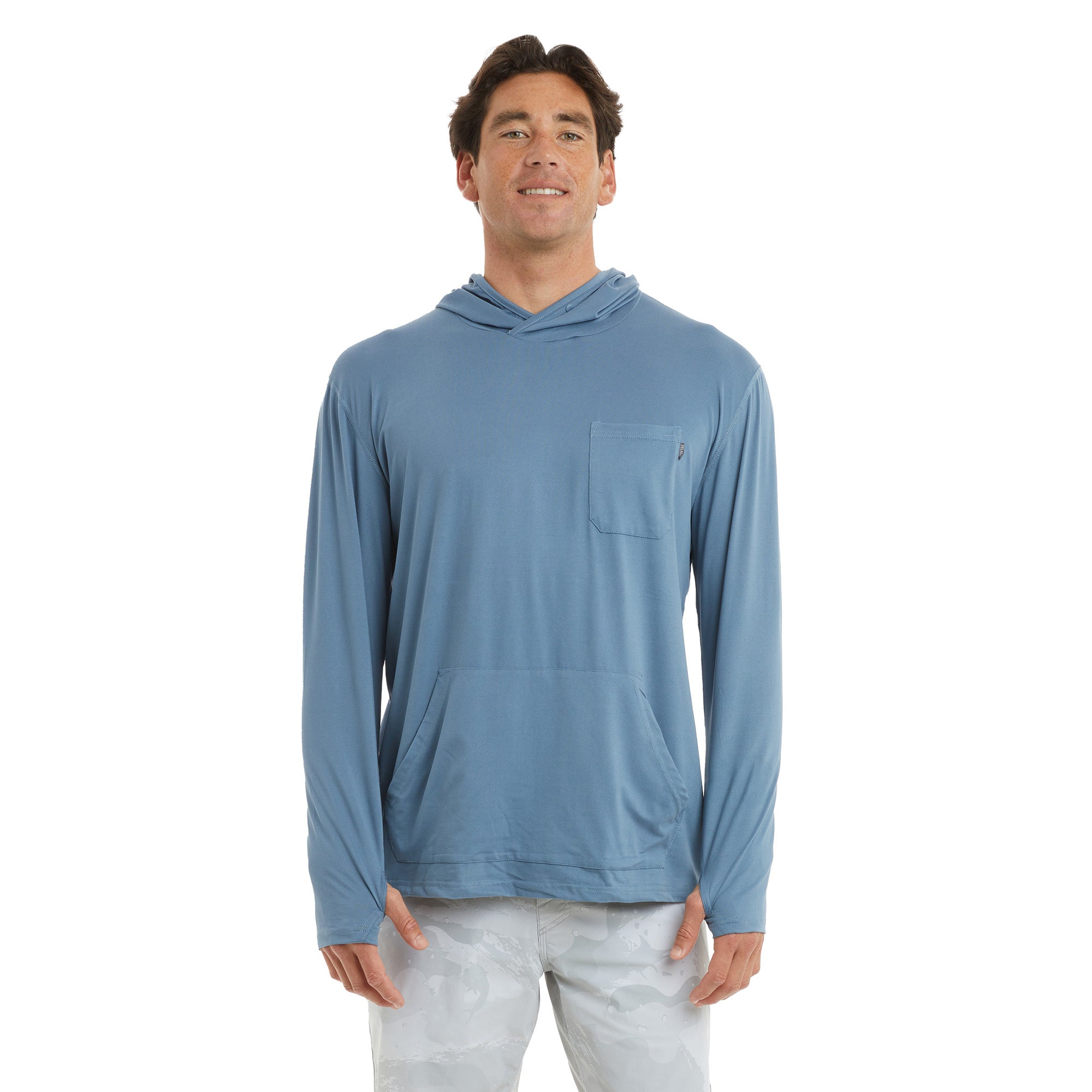 The Freespool performance top combines functionality and comfort for everyday use. Featuring 50+ UV protection, ultra soft quick dry recycled 4-way stretch fabric, snap hood, kangaroo hand pocket, thumb holes, and moisture wicking breathability.